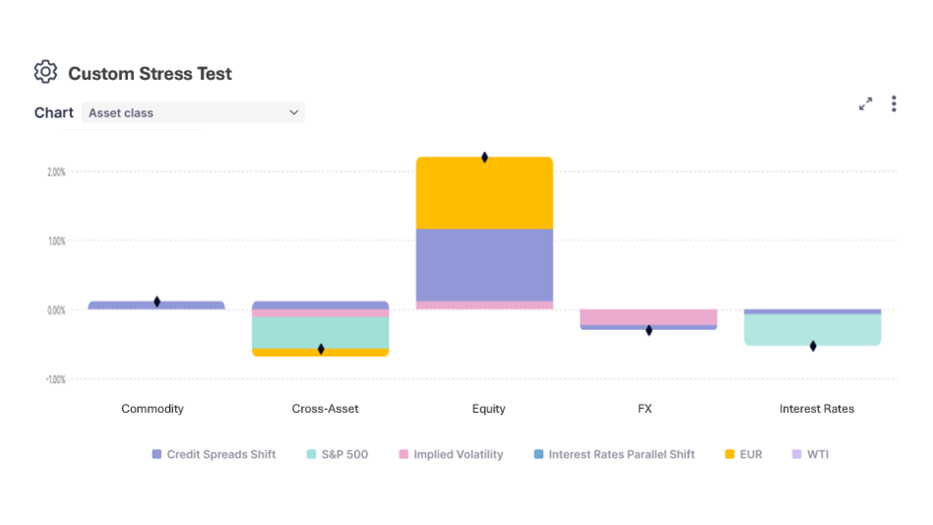 Create your own market scenarios by applying user-defined shocks across any combination of risk factors. These shocks propagate through the portfolio using correlation-aware dynamics, allowing you to measure the total impact of the scenario, not just isolated effects. Granular contribution analysis shows exactly how the shock spreads across positions and strategies, giving you full control to design, test, and interpret bespoke stress events in real time.