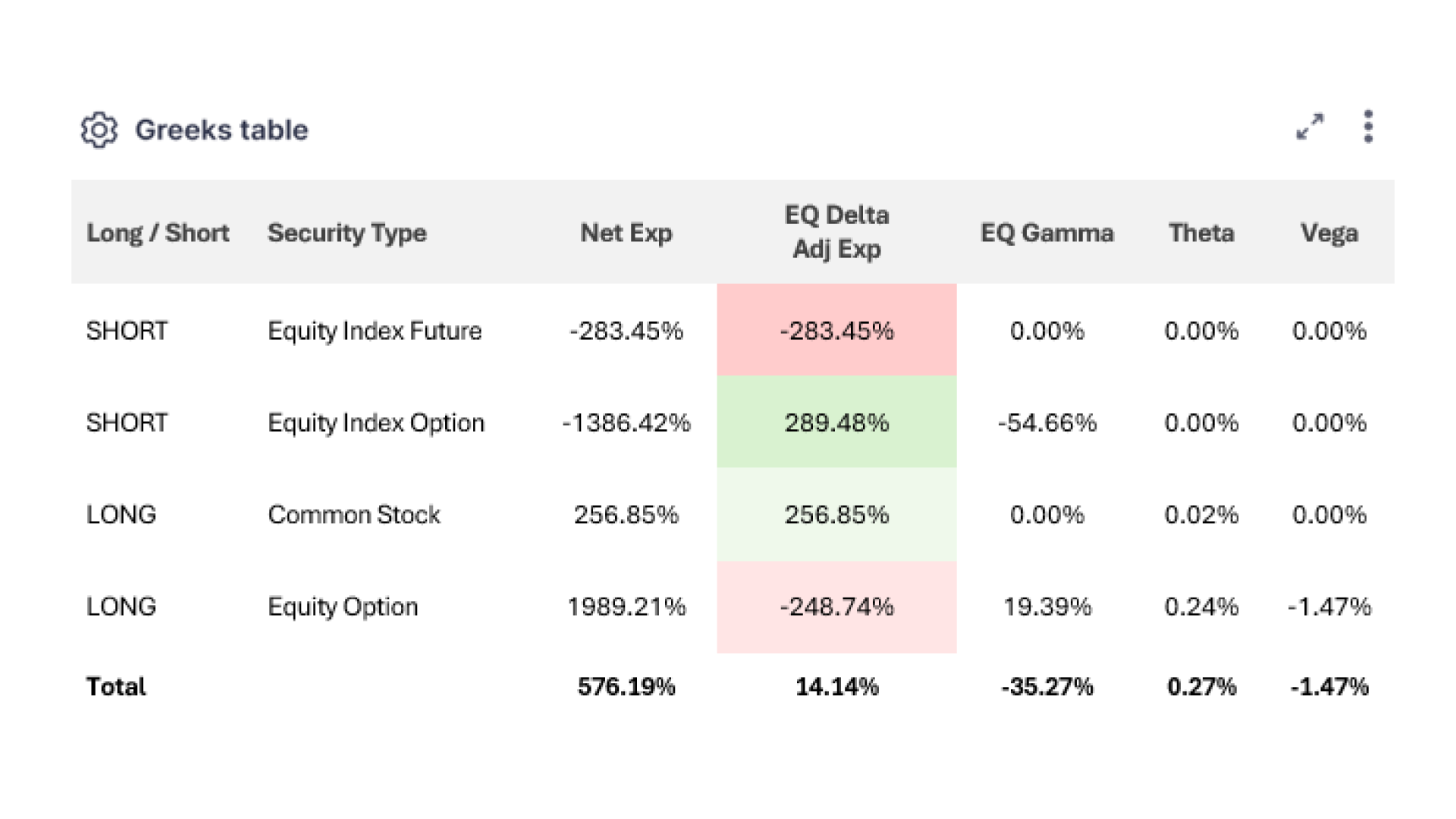 Obtain a clear snapshot of your portfolio’s option sensitivities at any point in time. Delta, gamma, vega, and theta are calculated consistently for every position across asset classes, providing a unified view of directional, curvature, and volatility exposure. With transparent long/short aggregation and instrument-level decomposition, you can easily identify where non-linear risks reside and how they shape your portfolio’s overall convexity profile.